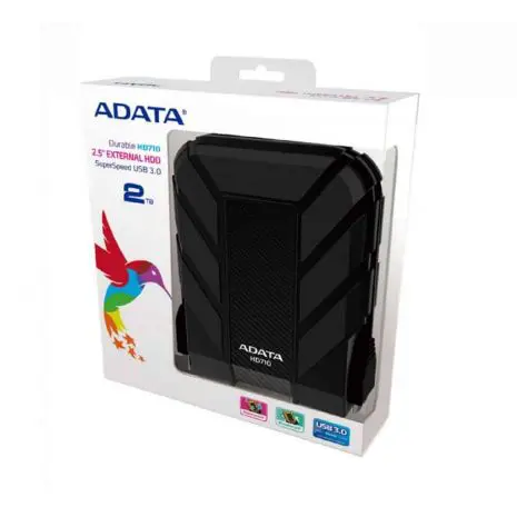Disco Duro Portátil HD710 Antigolpes ADATA de 1 y 2 TB, disponibles en colores negro y azul.